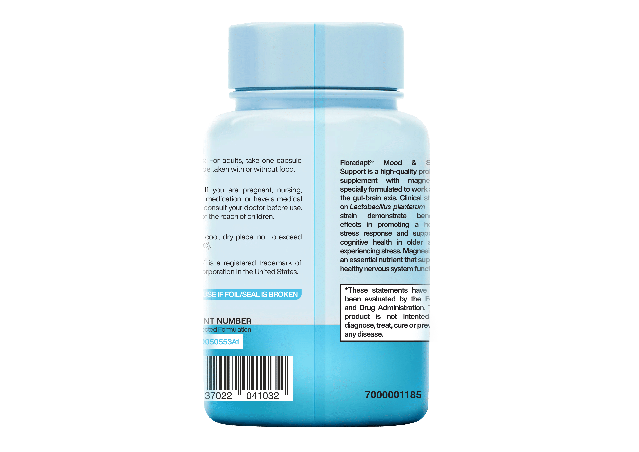 Floradapt™ Mood & Stress Probiotic contains the clinical strain Lactobacillus plantarum DR7 which has been studied for it’s impact on the Gut Brain Axis.* Mood & Stress Probiotic also includes Prebiotic which supports growth of good gut bacteria.*.
